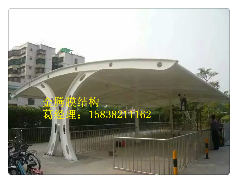是由多种高强薄膜材料及加强构件(钢架、钢柱或钢索)通过一定方式使其内部产生一定的预张应力以形成某种空间形状,作为覆盖结构,并能承受一定的外荷载作用的一种空间结构形式。是市民停放自行车的固定场所。
